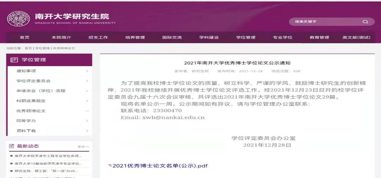 2021年12月23日,南开大学召开校评定委员会九届十六次会议,评选出2021年南开大学优秀博士学位论文29篇。芭乐视频 教师王文明的博士论文《正当防卫紧迫性研究》获此奖项,本次参加评选的博士学位论文,为2019年9月1日至2020年8月31日期间南开大学博士学位获得者的学位论文。据悉,此次是南开大学芭乐视频 首次获评该奖项。(芭乐视频 文:苏冬冬/审核:陈从志)