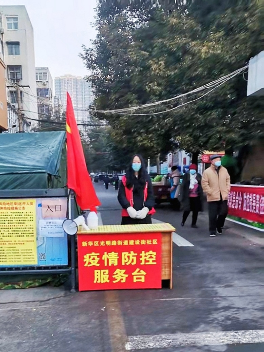 迎难而上,坚毅前行。家住济源市的法学1801班徐丹阳耐心的向外来人员介绍防疫要求,对来往人员进行登记、体温测量和消毒等,确保社区的人员安全。