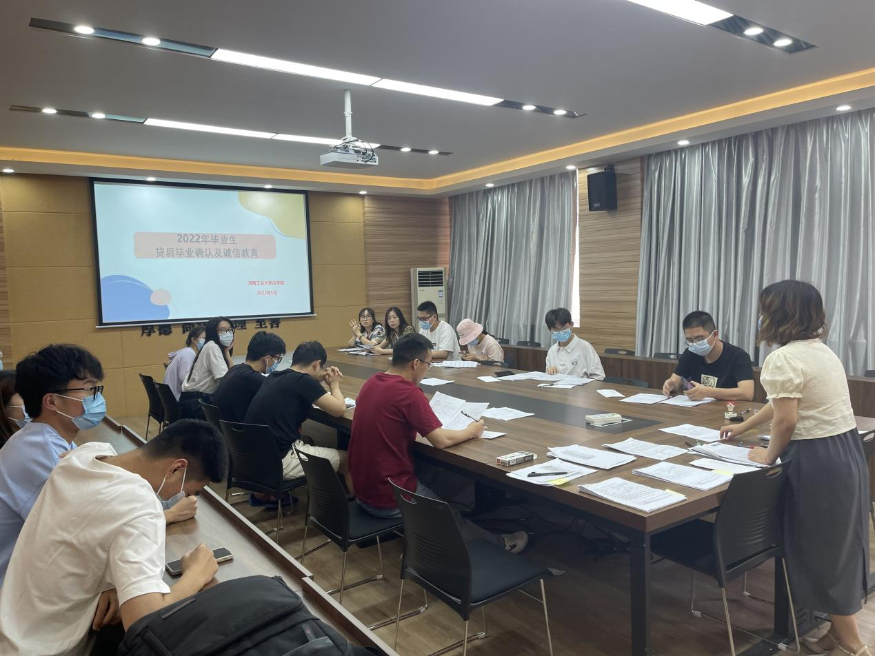 在3424会议室组织召开助学贷款毕业生现场毕业确认工作及诚信教育会议。辅导员周静、学生工作人员以及全体贷款毕业生参加了此次会议。