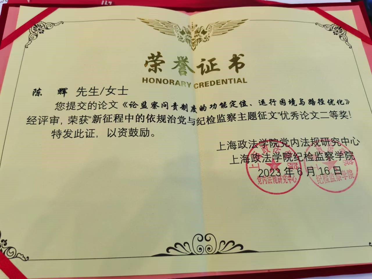 党内法规研究中心、纪检监察学院、马克思主义学院、法律学院及上海市法学会纪检监察法学研究会(筹)主办的“新征程中的依规治党与纪检监察理论研讨会暨全国首届党内法规与纪检监察研究生学术论坛”,并在论坛第二单元发言,发言主题为“论监察问责制度的功能定位、运行困境与路径优化”。该发言论文经专家学者评审,荣获“新征程中的依规治党与纪检监察主题征文”优秀论文二等奖。