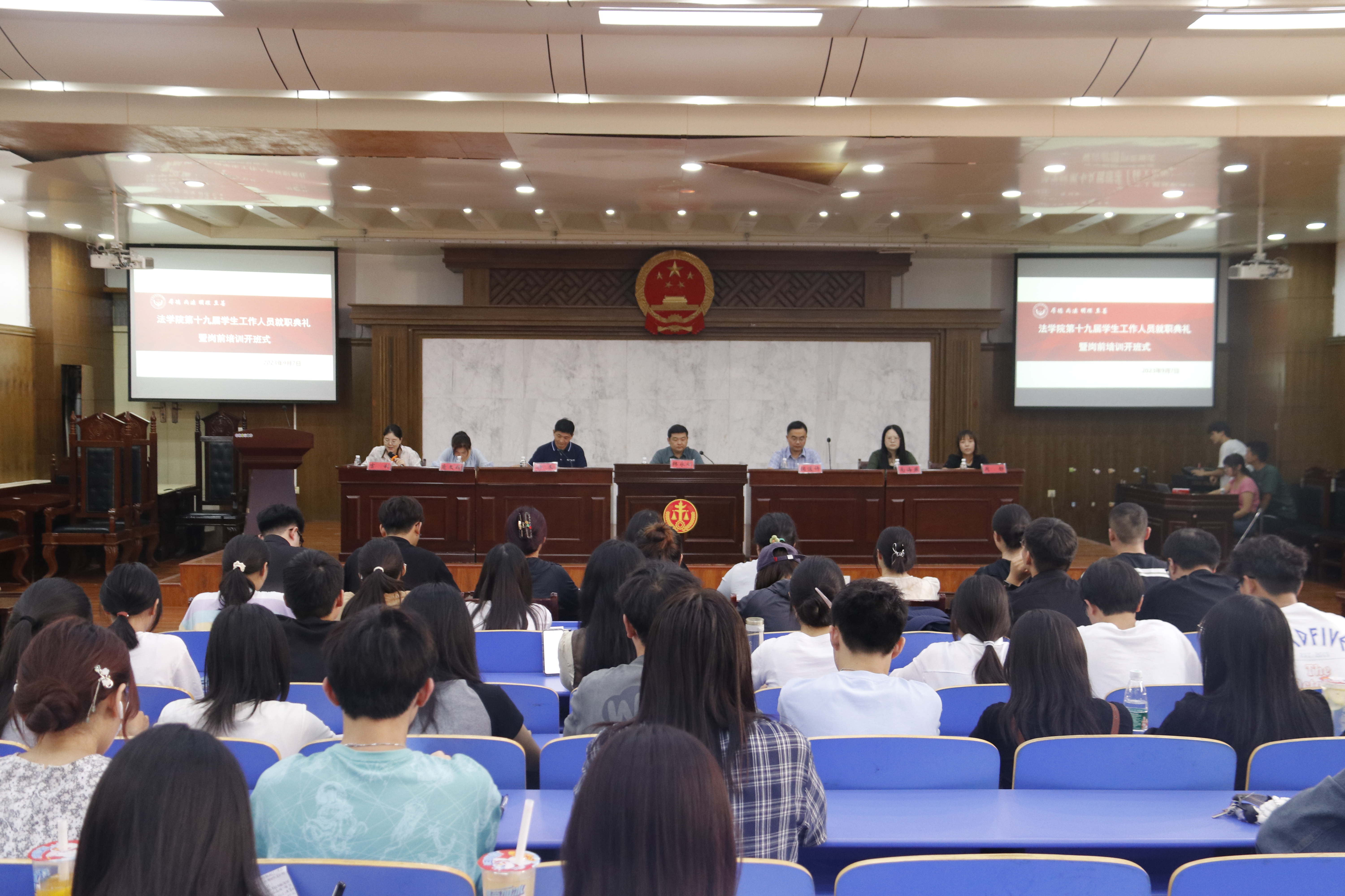 在3121学术报告厅举行第十九届学生工作人员就职典礼暨岗前培训开班式。学院党委书记韩永刚、院长张道许、党委副书记许文、副院长南海燕、学工团委全体老师出席会议,第十八届、十九届团委、学生会工作成员,各班班委、团支部成员参加会议。会议由团委副书记吉利主持。