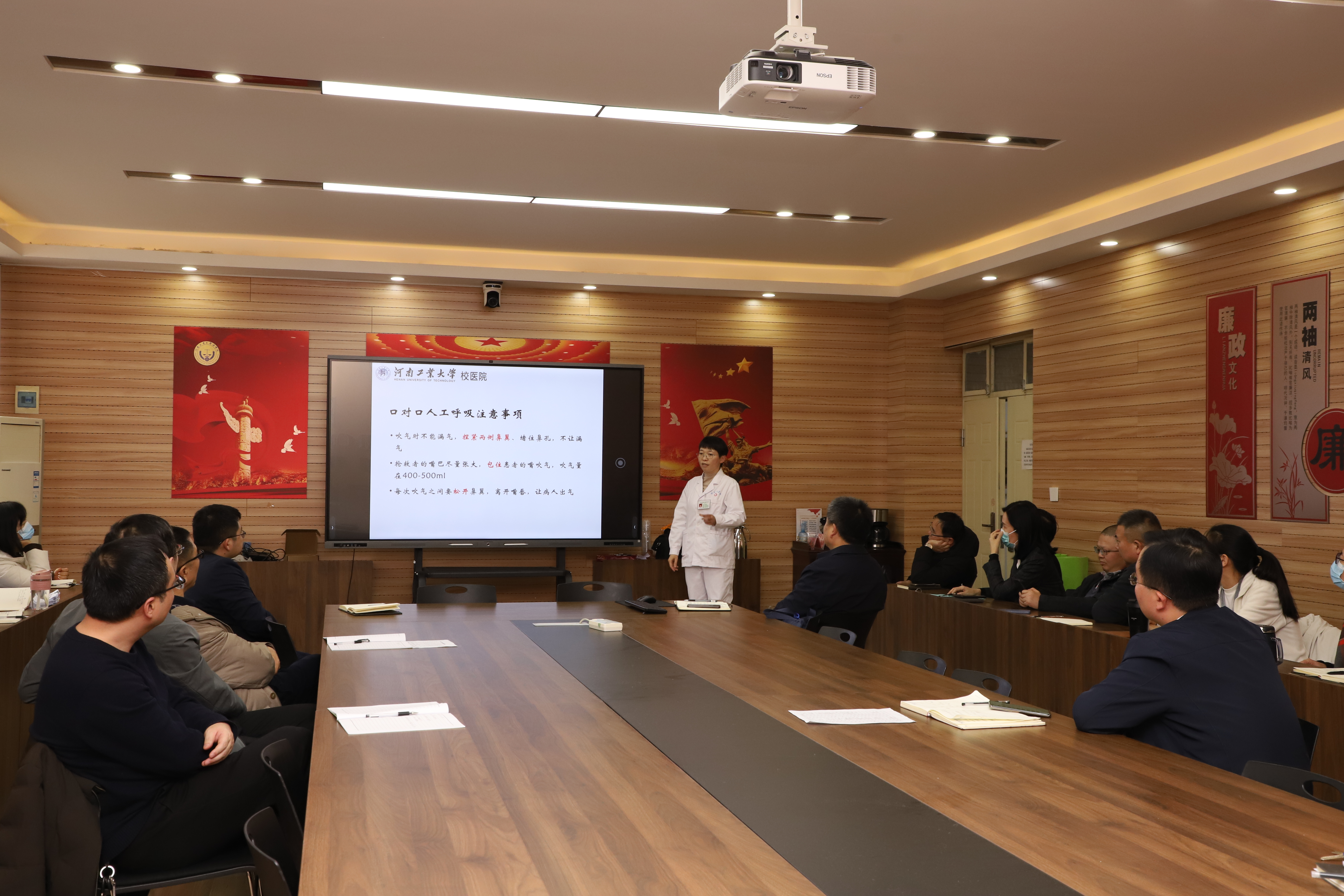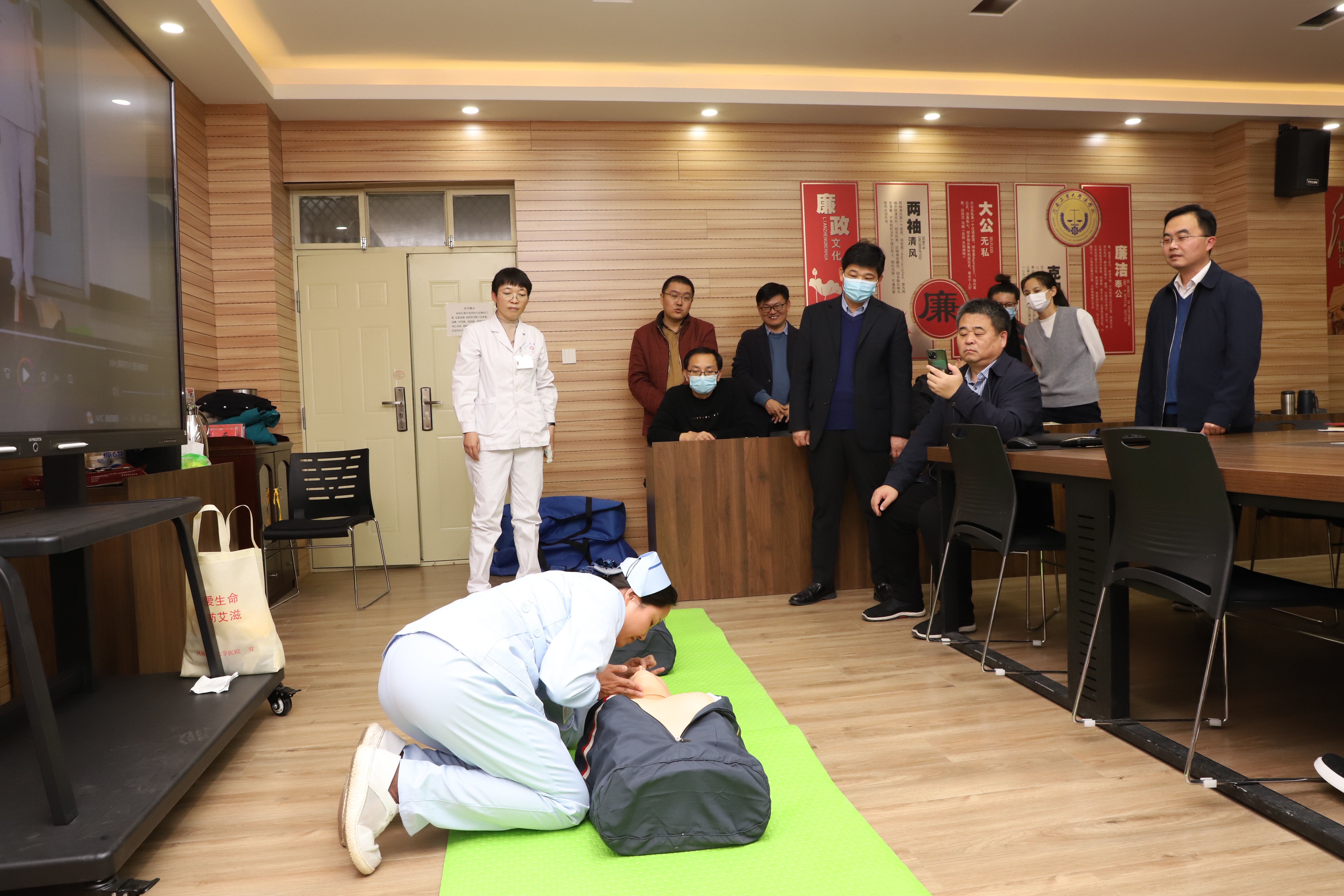 邀请校医院在3424会议室开展心肺复苏应急救护知识与技能培训活动。校医院医务科科长陈辉、护士长齐丽丽、药房组组长曹洁梅进行培训指导,芭乐视频