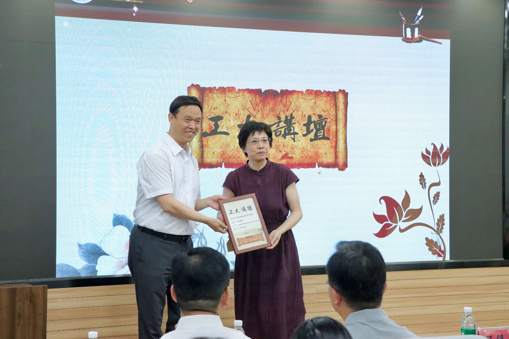 法治文化长廊,高度赞誉学院文化育人的成果,认为长廊浓缩法治文明之光,彰显传统文化之精髓。报告会伊始,黄泽峰向程雁雷表达了热烈的欢迎和诚挚的谢意,向与会者隆重介绍了程雁雷教授的基本情况,并赠送工大讲坛纪念海报。
