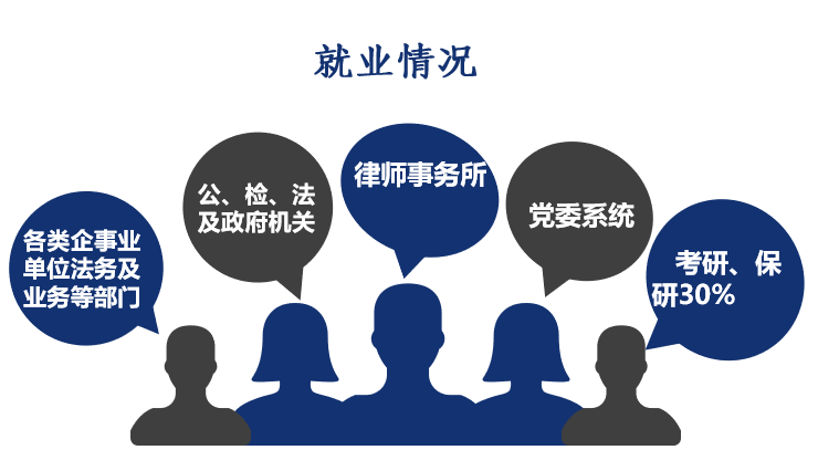 毕业生就业质量高。在校生司法考试通过率30%以上,考研率30%以上,名列省内前茅。考取研究生、公务员及事业单位的毕业生超过毕业生总人数的二分之一,毕业生广泛分布于公检法机构、党政机关、律师事务所、企事业单位法务部门等,深受用人单位好评。学院多次荣获“就业工作先进单位”“招生工作先进单位”“基层就业工作先进单位”等荣誉称号。