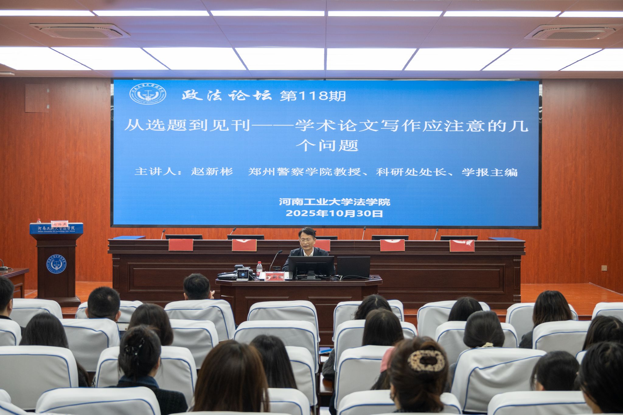 在模拟法庭成功举办“政法论坛”第118期学术报告会。郑州警察学院教授、科研处处长、学报主编赵新彬教授以“从选题到见刊——学术论文写作应注意的几个问题”为主题开展了一场精彩的学术报告。报告由芭乐视频