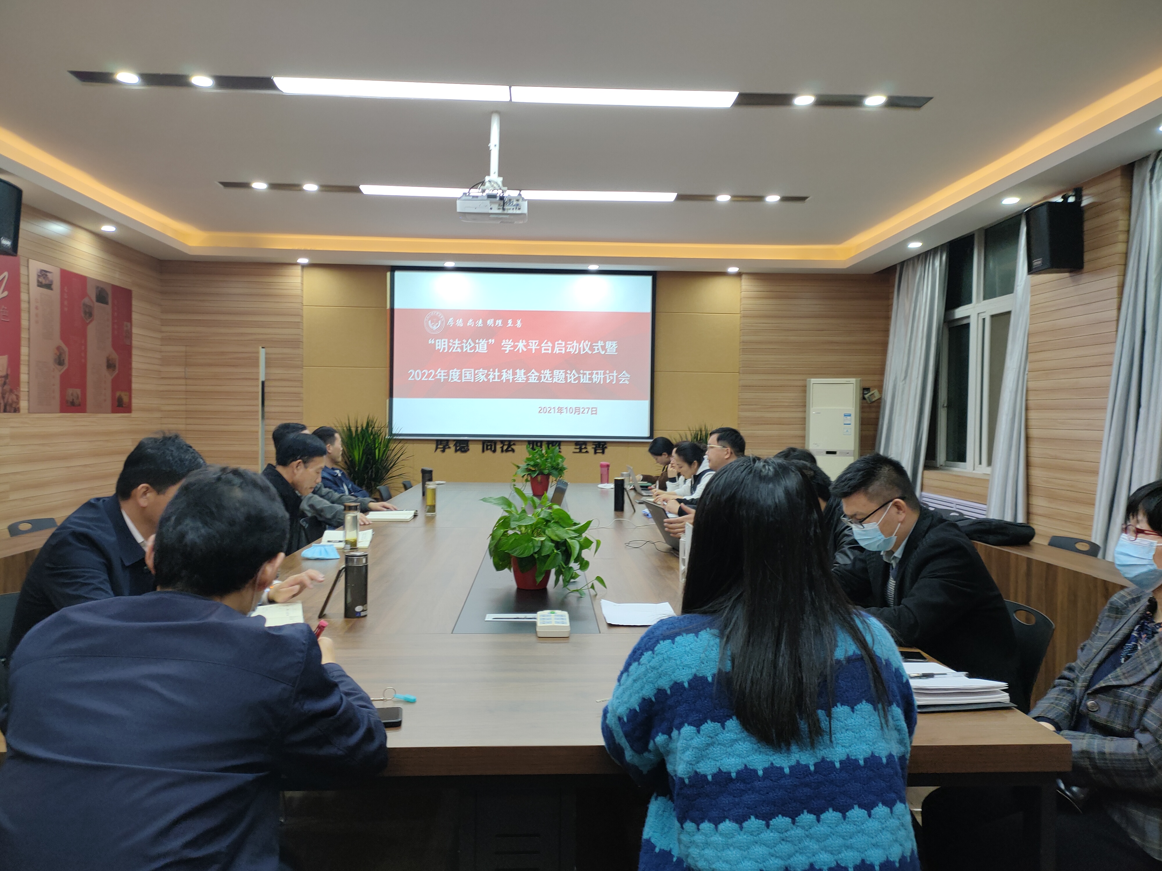 青年博士创新团队工作室采取“线上+线下”的方式举行了“明法论道”学术平台启动仪式暨首期学术研讨会,主题为“2022年度国家社科基金项目选题论证”。学院党委书记陈从志、院长张道许、副书记许文、院长助理(国际法教研室主任)南海燕、基础法教研室主任(工作室负责人)李耀跃、刑法教研室主任黄延峰、全体团队成员参加现场会议,其他老师参加线上研讨。