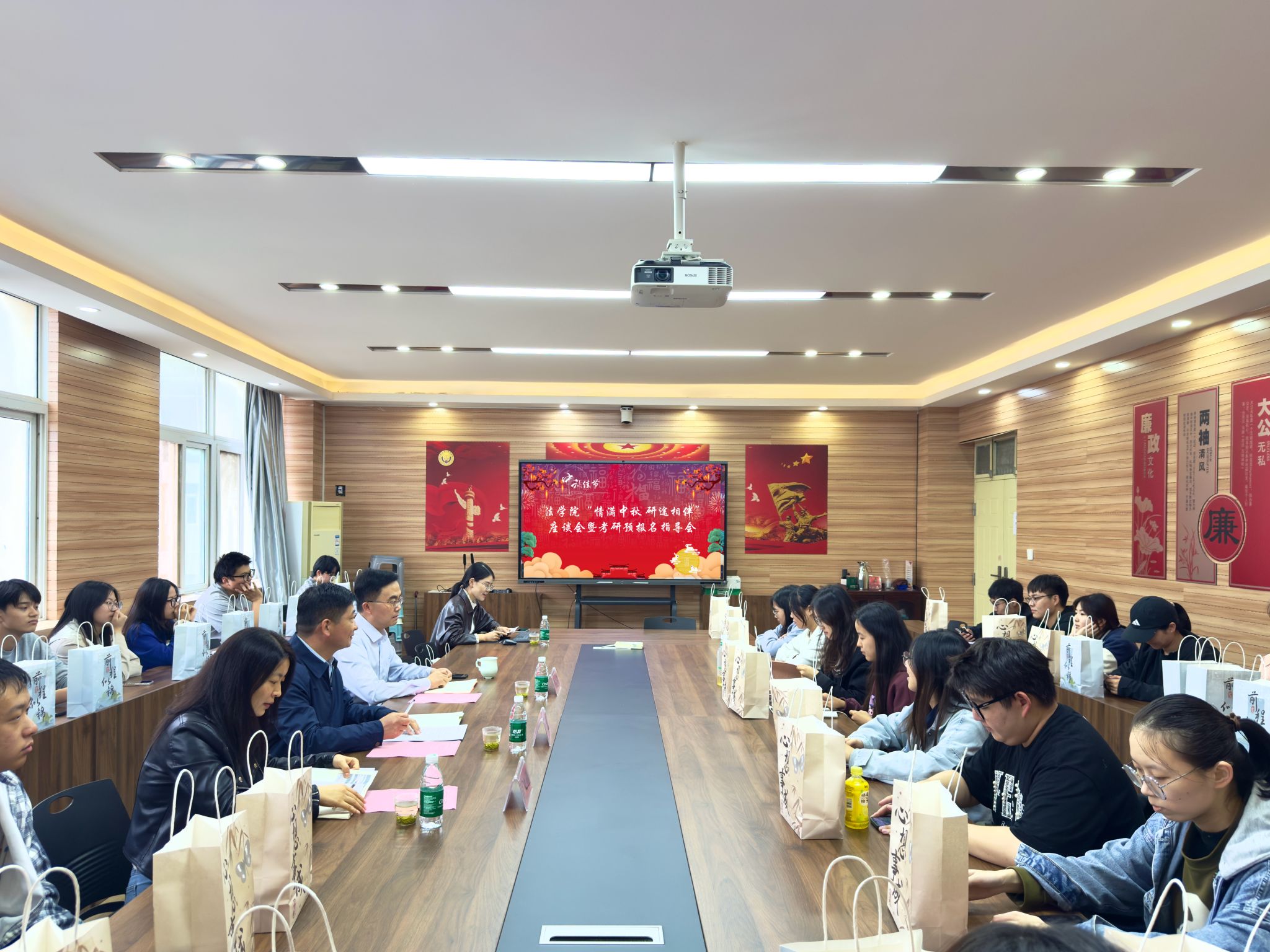 于3424会议室举办“情满中秋 研途相伴”座谈会暨考研预报名指导会。学院党委书记许文、院长张道许、学工办主任庞文娟、2022级辅导员吉利与留校考研学子齐聚一堂,共庆中秋,交流备考心得。
