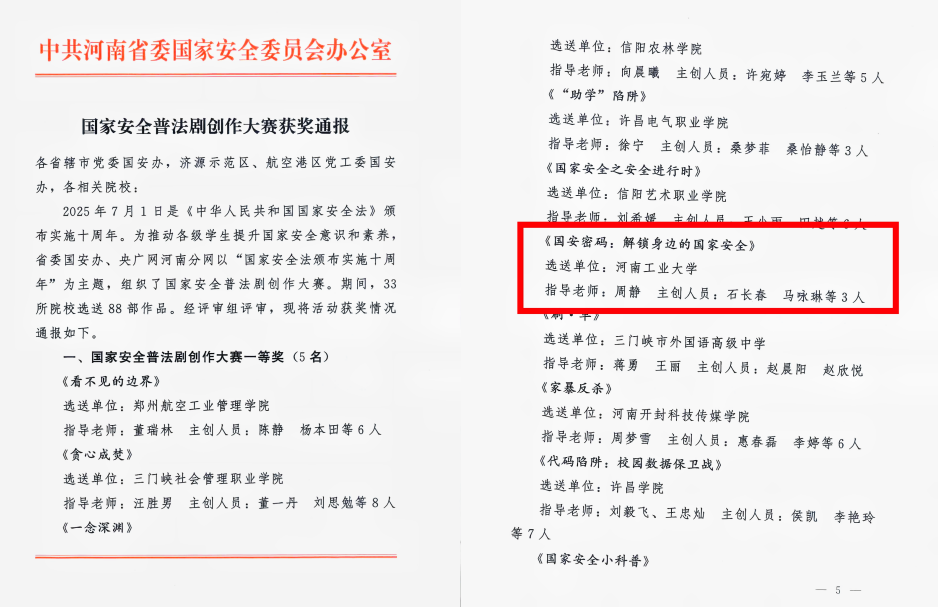 近日,中共河南省委国家安全委员会办公室公布了国家安全普法剧创作大赛获奖名单。经评审组评审,来自全省33所院校选送的88部作品中,芭乐视频 普法剧作品《国安密码:解锁身边的国家安全》脱颖而出,荣获大赛三等奖。