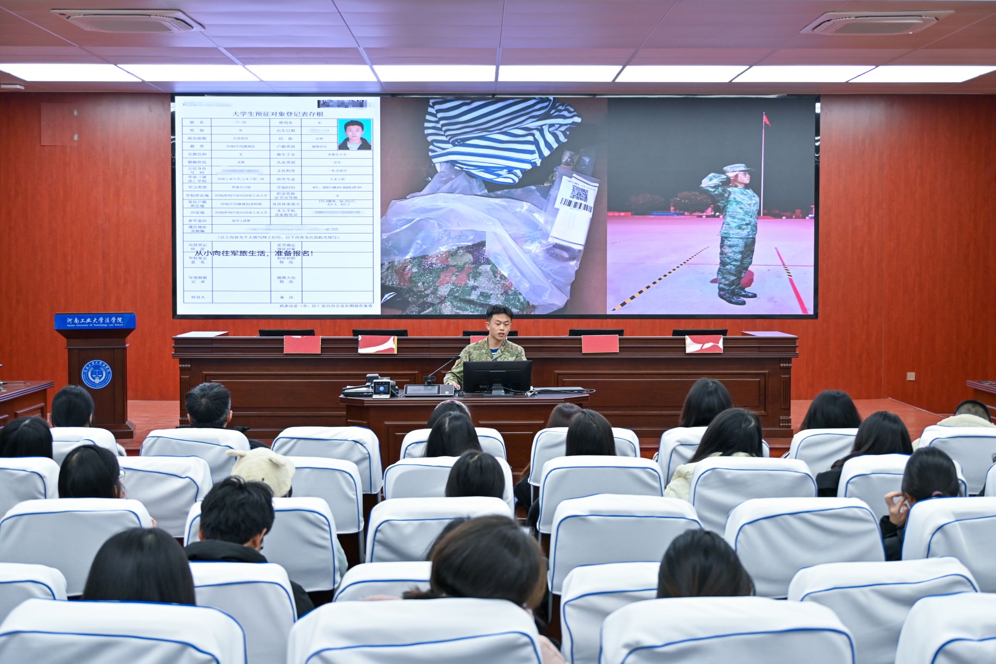 学生会副主席张健文从征兵条件、报名流程、体检标准、政治审查要求等几方面,详细解读了大学生参军入伍相关政策,重点阐述了“入伍后学业如何衔接”“不同军种的招录要求”等方面的内容,鼓励同学们积极响应国家号召,投身国防建设。
