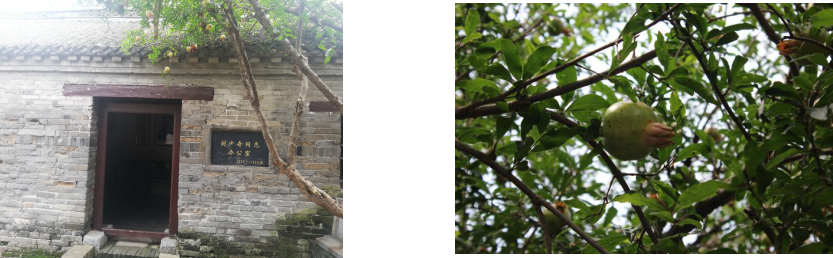 在刘少奇旧居的门前,我们发现了一棵富有传奇经历和神秘色彩的石榴树。据说,刘少奇同志赴任竹沟之初,种下了一棵石榴树,年年岁岁春天叶绿花红,秋天硕果累累,给百忙之中的刘少奇带来了不少欣慰和牵挂,这棵石榴树也把鲜红的花瓣和丰厚的果实回馈给了竹沟人民。国民党武装人员围剿竹沟时,拦腰斩断了它,但是竹沟惨案之后,石榴树又长出了新枝,盛开鲜花结满硕果。穷凶极恶的造反派,将它连根拔起,遗弃街头,纯朴善良的群众偷偷剪下枝丫,浇水施肥细心培养,劫后重生的石榴树重新焕发生机,如今年年鲜花盛开、硕果累累,映红了确山竹沟,映红了中原大地、大江南北、长城内外......