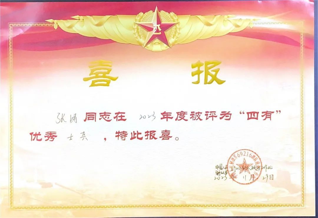 张涛荣获“四有”优秀士兵称号,这一荣誉充分见证了他作为军人坚定不移扎根军营,矢志不渝追求卓越的成长历程。这一荣誉不仅是他青春奋斗的珍贵印记,更是他坚持不懈、百折不挠的顽强毅力和拼搏精神的生动体现。张涛通过努力和汗水,将自身锻造成一名钢铁战士,展现出新时代军人的良好形象。