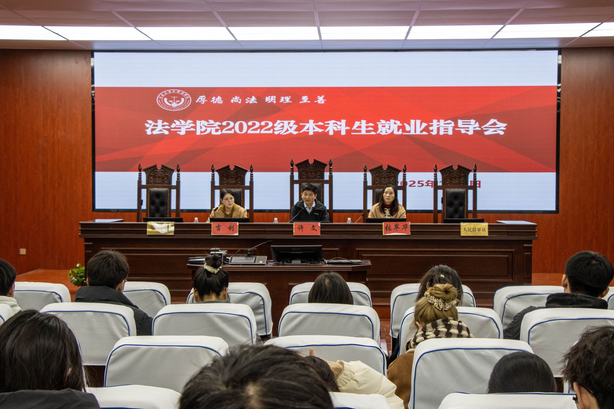 在智慧模拟法庭召开2022级本科生就业指导会。学院党委书记许文、党委副书记张翠华以及2022级全体同学参加会议,会议由辅导员吉利主持。