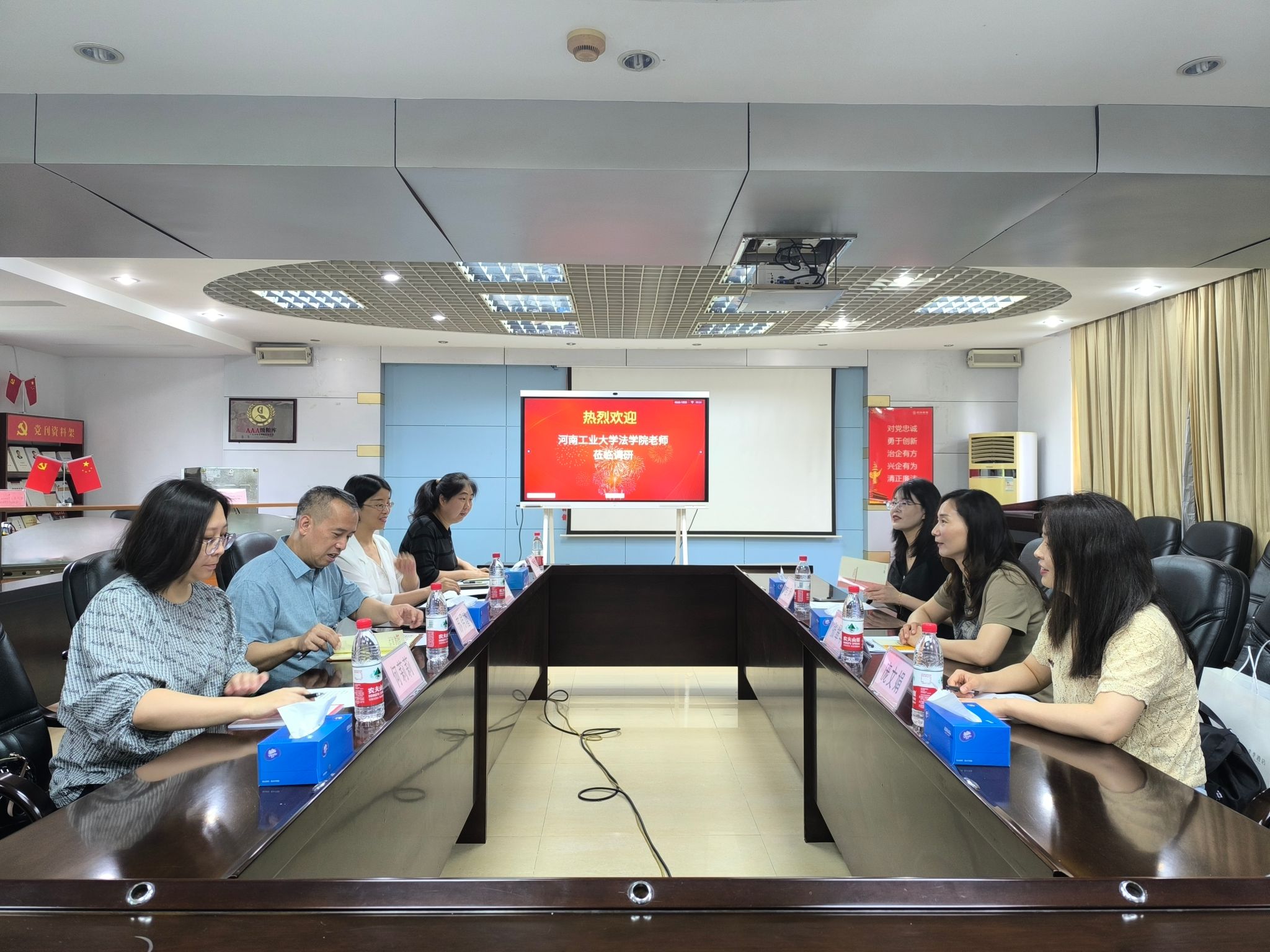 老师参观了律所的文化墙和办公区域,律所管委会主任李日衡介绍了律所的发展历程与规模特色。在随后的座谈交流中,张翠华介绍了学校的办学历史、办学特色、学院发展现状、学科布局和学生就业情况,双方就行业发展现状、业务特色、法学人才培养模式等展开深入交流与探讨。
